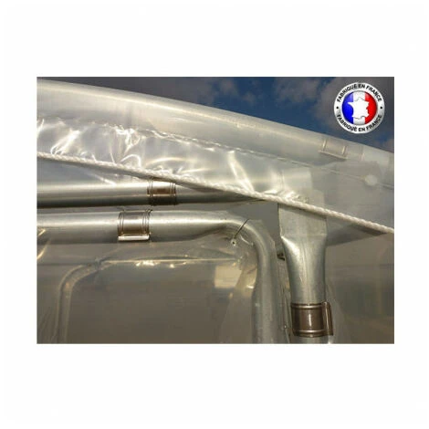 La bâche de serre est une bâche professionnelle thermique tri couche de 200 g/m², fabriquée et confectionnée en France, enterrée sur les longueurs et tendue par ourlet et cordelette sur les arceaux. Cela permet une pose rapide, esthétique et durable. Elle est garantie 5 ans contre les UV (hors bassin méditerranéen). La fixation des bâches pignons se fait par des clips en INOX.