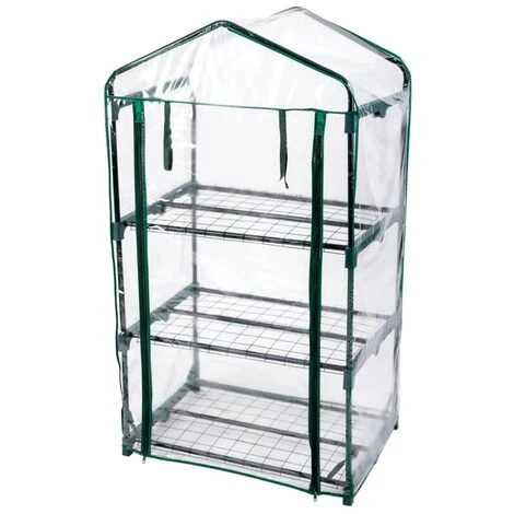 Serre de jardin à 3 étages structure de couleur verte et housse transparente.