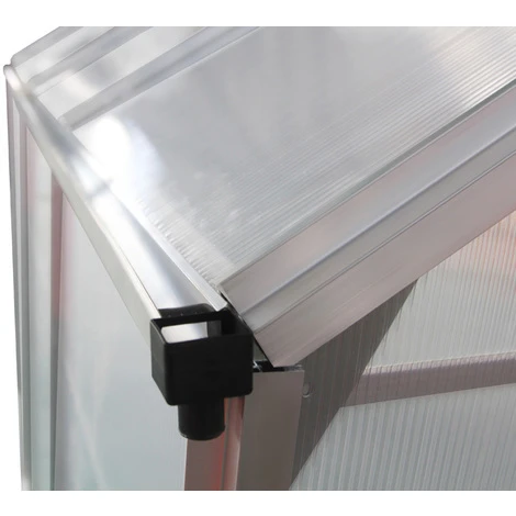 : – Polycarbonate léger (facile à monter et à transporter) – Isolant garantissant un climat optimal dans la serre (40% déconomie de chaleur) – Diffusion totale de la lumière (Traité anti-UV) – Stabilité de la structure métallique renforcée par laluminium – Traitement anti rouille – Assemblage facile et sans entretien – Équipée de 1 ouverture manuelle de toît – Poids maximum supporté/m² : 10 kg.