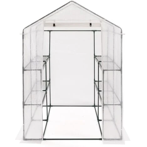 Descriptif de la serre de jardin 8 étagères avec 2 fenêtresGrâce à cette serre de jardin, d’une hauteur de 200 CM et ses 8 étagères très pratiques, optimisez le rangement et l’entretien de vos plantes durant toutes les saisons. Sa grande surface de stockage vous permet d’entreposer et de protéger toutes vos plantes jusqu’à 200 cm de hauteur maximum, sans monopoliser votre jardin ! En effet, cette serre de 140 CM de côté s’installe facilement dans n’importe quel jardin, petit ou grand.Composée d’une structure et d’étagères en acier, vous n’aurez pas à vous soucier ni de la stabilité de la serre de jardin, ni de sa robustesse. Aucune crainte à avoir pour vos plantes ! Ses étagères grillagées permettent non seulement d’y stocker de nombreuses plantes sans risquer de s’affaisser, mais aussi tout le petit matériel nécessaire à l’entretien de vos plantes. Sécateurs, râteaux à main, truelles ou encore sacs de terre y sont donc les bienvenus.Une bâche épaisse en PE de 140g/m² vient s’installer sur la structure, et créer le climat parfait pour les plantes installées dans la serre. Toutes vos cultures y seront à leur aise, tant en été qu’en hiver où elles seront à l’abri du froid ! Vous trouvez cela dur à croire? Une jupe en continuité de la bâche permet d’encrer la serre au sol, évitant tous les courants d’air ou autres insectes malvenus qui tenteraient de s’inviter par le dessous.Equipée de 2 fenêtres de 30×30 CM avec moustiquaires, vous pourrez aérer vos plantes grâce à ces ouvertures sans craindre qu’elles soient envahis de nuisibles. Vous pourrez tout aussi bien décider de les protéger au maximum en les refermant.La serre dispose également d’une grande porte de 75×170 CM afin de vous permettre de faire rentrer facilement vos plantes à l’intérieur et d’y accéder en toute simplicité.Dimensions de la serre de jardin 8 étagèresDimensions de la serre : Longueur 140 CM x largeur 140 CM x Hauteur 200 CMDimensions d’une étagère : Longueur 58 CM x largeur 28 CM x Hauteur 48 CMBâche transparente en PE 140g/m²Structure en tubes d’acier et connecteurs plastiquesDiamètres des tubes : 16mm2 fenêtres de 30 x 30 CM1 porte de 75 x 170 CMRetrouvez toutes nos serres de jardin sur notre boutique en ligne !