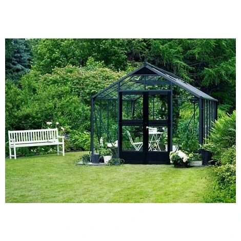 Cette serre Premium de 10.9 m² a été pensée et agrémentée de détails. Elle existe en coloris brut Aluminium ou laquée en Anthracite et dans les 2 cas les ferrements, les portes et fenêtre sont recouverts d’un thermo-laquage noir pour un style unique et original.