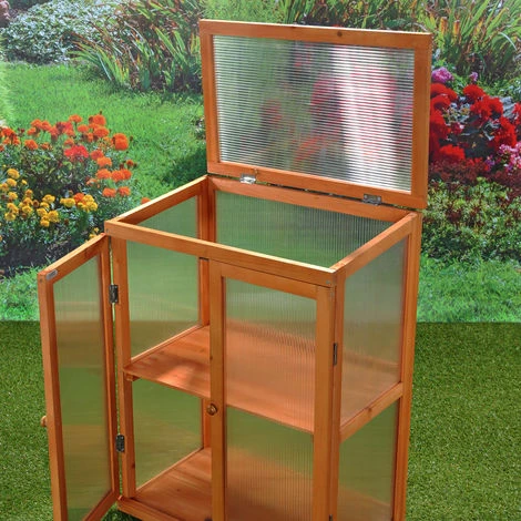 Ajoutez cette serre à votre espace extérieur et profitez de ses avantages attrayants. Le cadre est en épicéa brun clair et se concentre sur les vitres transparentes qui décorent le devant et le dos ainsi que la surface du modèle. Le design classique est perfectionné par les deux portes qui s’ouvrent à l’aide de boutons. Grâce au couvercle à charnière, il n’y a aucun problème lors de l’arrosage ou de l’enlèvement des plantes. Bien entendu, la serre protège également vos fleurs des variations climatiques. Placez le modèle fonctionnel et décoratif là où vous aimeriez voir pousser vos plantes – sur la terrasse, sur le balcon ou dans le jardin.