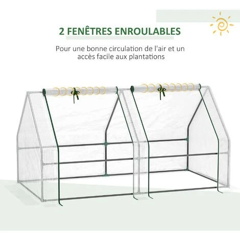 Cette mini serre de jardin protègera efficacement vos plantes afin d’en tirer le meilleur rendement possible. Equipée de 2 fenêtres déroulantes avec zip et cordons de maintien, d’une structure an acier thermo-laqué, et d’une bâche rallongée, vous pourrez sereinement lancer votre nouvelle production agricole. Caractéristiques : – Idéal pour protéger vos plantes (fleurs, fruits et légumes) contre le froid, la pluie, les insectes, oiseaux, etc… – Bâche transparente en polyéthylène imperméable anti-UV haute densité 140 g/m² rallongée d’une dizaine de cm pour un meilleur maintien au sol – 2 fenêtres enroulables avec zip et cordons de maintien afin de vous adapter parfaitement aux conditions climatiques – Châssis tubulaire en acier thermo-laqué diamètre 1,6 cm, + 5 tubes transversaux pour un usage pérenne – Notice d’assemblage et d’utilisation fournie – Montage démontage + entretien facile Spécifications : – 2 coloris au choix : vert ou blanc – Matériaux principaux : acier thermo-laqué, PVC et polyéthylène haute densité 140 g/m² – Dimensions totales : 180L x 90l x 90H cm – Dimensions fenêtres : 60L x 90l cm – Diamètre châssis tubulaire : 1,6 cm – Réf. : 845-204GN/204V03WT