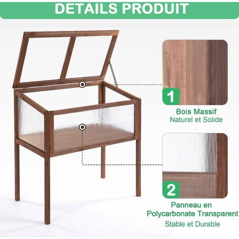 Cette jolie mini serre de jardin sur pieds avec toit ouvrable vous permettra de protéger vos plantes, légumes, etc… durant l’hiver et le printemps. Sa conception et fabrication en bois massif de sapin traité et panneaux de polycarbonate vous assureront protection et rendement.