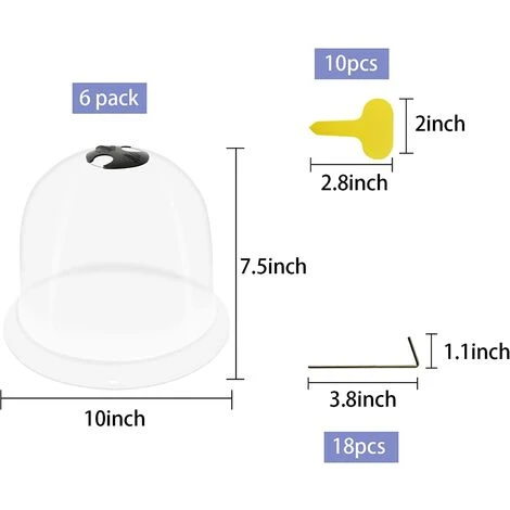 Forfait de performance à coût élevé – comprend 6 cloches de jardin (chaque cloche mesure 10″ de diamètre et 7,5″ de hauteur), 18 piquets de fixation au sol, 10 étiquettes de plantation.