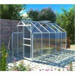 Serre en polycarbonate « Multiline » – 5.6 m² La nouvelle ligne de serre « Multiline » de la marque PALRAMalliedesign et élégance grâce à ses panneaux en polycarbonate translucide. La fusion de deuxpanneaux en polycarbonatepratiquement incassables(traité anti – UV)permetuneexposition au soleilsans dégradation du polycarbonate sur le long terme.Le toitdoté d’une parroidoubleoffre une protectionmaximum au soleil. Les panneauxen polycarbonate opaquesfournissent plus de70%de transmission de lumièreau cours de la journée. La serre « Multiline » est équipée d’une fenêtre d’aération. Ce produit est très robuste et sans danger,panneauxen polycarbonate incassable de grande qualitéet trés résistants. La baserobuste enacier galvanisérésiste àla rouillepour une durée de vie acrrue. Cette serre a été conçue pourêtre montéefacilement. Une notice explicite et détaillée vous aideraà monter votre serre »Multiline » aisément. IMPORTANT: Visuel de mise en situation non contractuel, serrre vendue sansmatérielde jardin. : La serre en polycarbonate est idéale pour la protection de vos plantes et de vos cultures. Ses parois en polycarbonate vous permettrons de faire bénéficier à vos plantes la lumière du soleil ainsi que des température optimale pour leurs croissances. Structure : Structure en aluminium – Panneaux en polycarbonate opaque double épaisseur 4 mm – Base en acier. Couleur : Aluminium. Kit fondation : Base incluse. Porte(s) : Une porte simple battante. Extérieures : Larg:1,85 x Prof: 3,06 x Haut:2,08 m. Surface intérieure (en m²) : 5,6 m². Porte(s) : 1 porte battante – Dimensions : 0,56 x 1,63. : – Cette serre saura résister dans le temps. – La base en acier est galvanisé afin de la protéger contre la corrosion. – Les parois sont doubles. . Nombre de colis : 2. Poids : 46 kg. Colisage : 2 colis : – 3,25 x 0,19 x 0,11 m, 29 kg – 1,2 x 0,62 x 0,12 m, 17 kg. Hauteur : 2 à 3 m. Portes : Une porte. Surface : 5 à 10 m².
