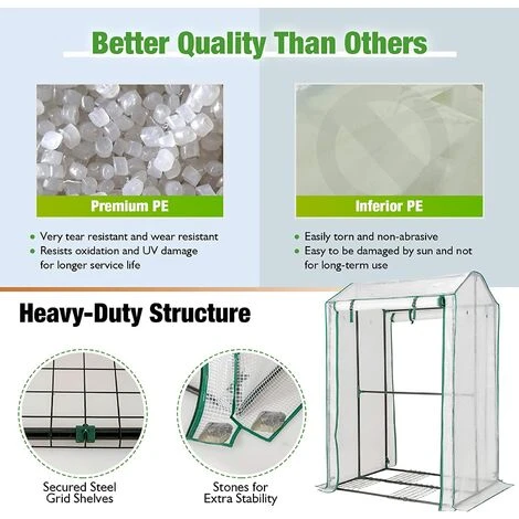 - â COUVERTURE PE ĂTANCHEâ la couverture de notre serre de jardin est fabriquĂ©e en PE de haute qualitĂ©, qui prĂ©sente une bonne rĂ©sistance Ă l’eau et une bonne durabilitĂ© et qui ne vieillit pas facilement aprĂšs une exposition au soleil. Elle offre un environnement de croissance chaud et confortable pour vos plantes bien-aimĂ©es.