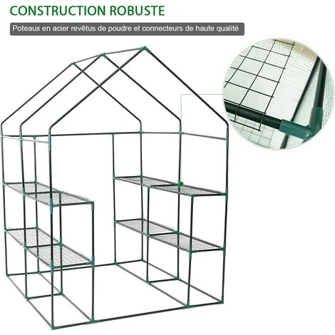 Notre serre avec étagères créera un environnement de croissance stable pour vos plantes! Les 2 côtés de l’intérieur avec étagères vous permettent de placer les plantes. La bâche imperméable crée la bonne température de croissance pour vos plantes. La portes avec fermetures à glissière facilite l’entrée et la sortie. La serre peut être placée dans les cours et les fermes, c’est le lieu de croissance idéal pour les plantes, les fleurs et les légumes.