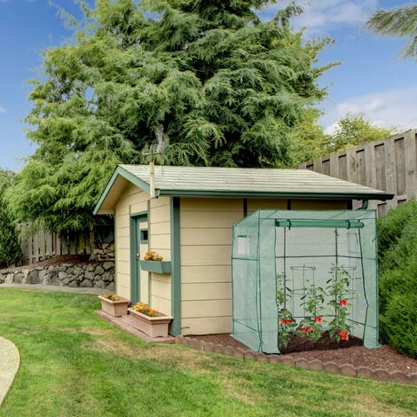 Avec cette serre, à vous les tomates goûtues ! Elle crée les conditions idéales pour la culture des légumes qui aiment la chaleur : de la chaleur sèche. Cette serre de jardin est constituée d’une structure solide en fer et d’un toit incliné permettant non seulement l’évacuation de l’eau de pluie, mais également une bonne répartition de la chaleur dans la serre, grâce à sa bâche en PE translucide. Les deux fenêtres latérales avec filet permettent d’évacuer l’humidité et d’éviter les parasites. La porte est large et haute, ce qui facilite l’accès et le soin de plantes.