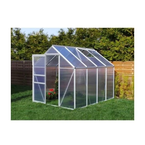 Serre en polycarbonate de 4 mm. Cette serre est Ă©quipĂ©e d’une porte coulissante et d’une lucarne. La serre comprend des gouttières intĂ©grĂ©es. Les profilĂ©s en aluminium sont prĂ©dĂ©coupĂ©s et prĂ© percĂ©s, permettant un assemblage facile par boulons et Ă©crous.