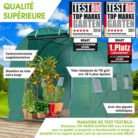 Le magazine de test-produits allemand le plus sévère, TESTBILD, nous a décerné le prix TOP MARKE GARTEN 2019 avec 5 étoiles pour nos serres à film BRAST, ceci en termes de qualité, durabilité, fonctionnalité, design, viabilité et relation qualité/prix. Grâce au nouveau film amélioré, nous avons atterri également à la 1ère place de nouveau en 2021 avec 5 étoiles (durabilité) !