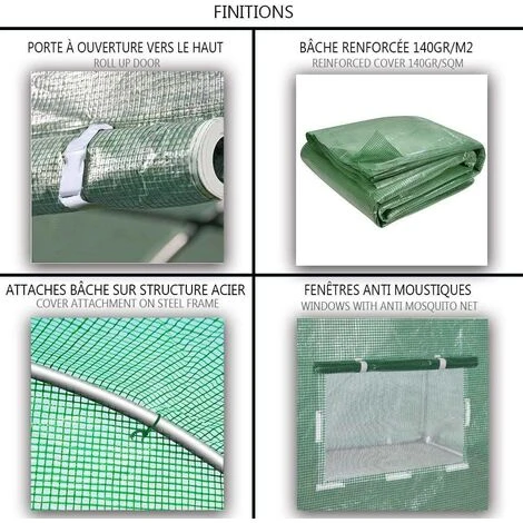- Notre serre de tunnel jardin a une bâche polyéthylène haut densité 140g/m² traitée anti-UV qui protégera et optimisera votre culture.