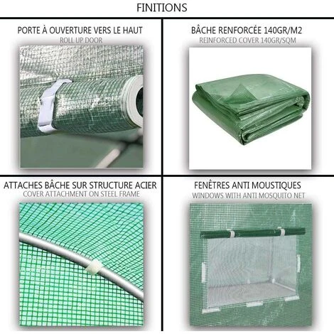 - Notre serre de tunnel jardin a une bâche polyéthylène haut densité 140g/m² traitée anti-UV qui protégera et optimisera votre culture.