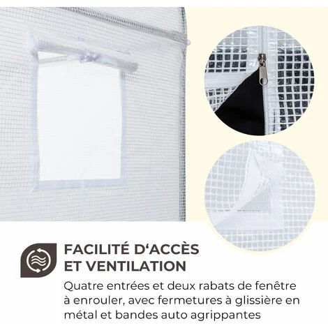 La serre souple Waldbeck Plant Palace X2 offre été comme hiver un lieu idéal pour la culture de plantes sensibles aux intempéries. Montez en un rien de temps le solide cadre en tubes d’acier entièrement galvanisés de 25 mm d’épaisseur et posez le film résistant en PVC mesh. Le film se distingue par sa résistance extrême: résistant à la déchirure, translucide et hydrofuge, il sépare l’intérieur de l’extérieur et crée sa propre atmosphère protectrice pour les plantes. Tomates et concombres poussent tranquillement au jardin dans le froid de l’hiver et sont protégés de la pluie excessive en été. Pour réguler le climat intérieur, mais aussi pour faciliter l’accès de tous les côtés, la serre est équipée de quatre portes et de deux rabats de fenêtres à enrouler. Des bandes auto agrippantes et des fermetures à glissière métalliques assurent un maintien stable et une longue durée de vie. Pour que la tente en aluminium résiste aux vents encore plus forts sans que vous ayez à la déplacer, elle est livrée directement avec des piquets et des haubans pour une fixation sécurisée.